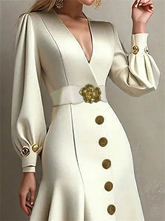 Lemongor Women British Style Elegant Evening Midi Dresses 2024 Autumn Puff Sleeves Tied Waist V-N...